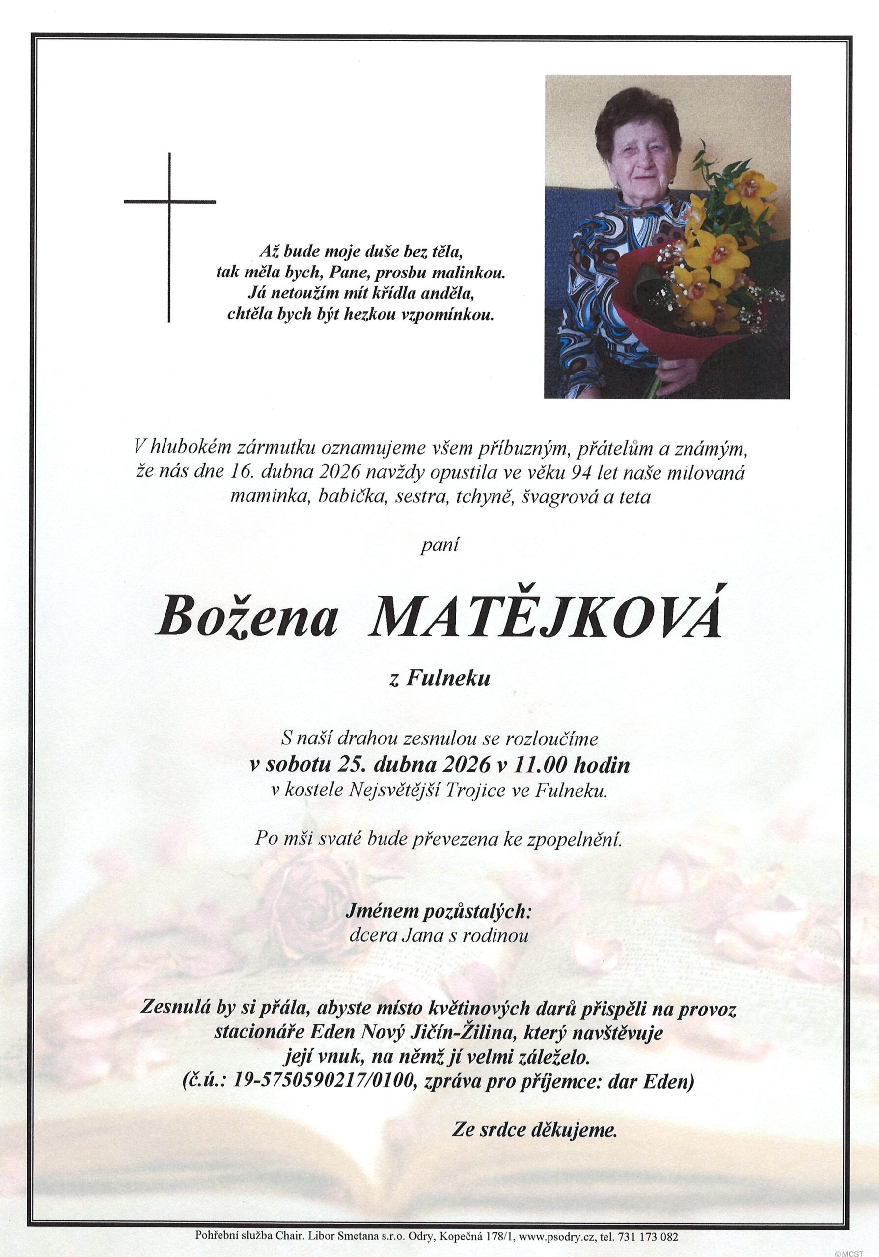 Smuteční oznámení neboli parte je zprávou o úmrtí vašeho drahého zesnulého. V naší kanceláři je vždy zpracovávané na míru s velkou precizností podle vašeho přání. V nabídce máme spoustu druhů ...